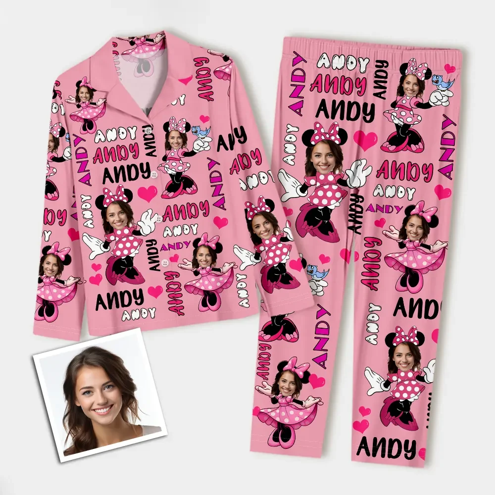 Custom Long Sleeve Pyjama With Your Face Mickey Minnie Mouse Pattern Valentine's Day Gift For HerCustom Long Sleeve Pyjama With Your Face Mickey Minnie Mouse Pattern Valentine's Day Gift For Her