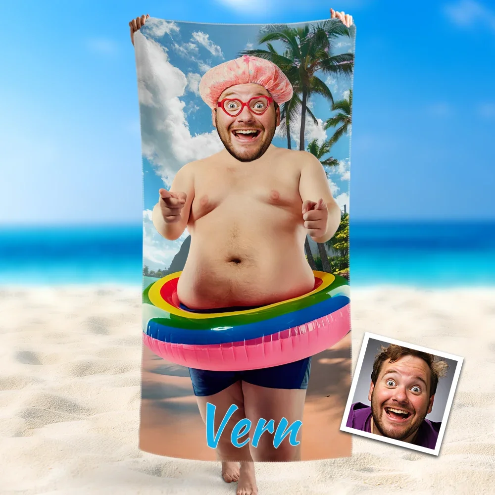 Custom Photo Beach Towel, Quick Dry Bath Towel, Funny Man With Swimming Ring Swimming Towel