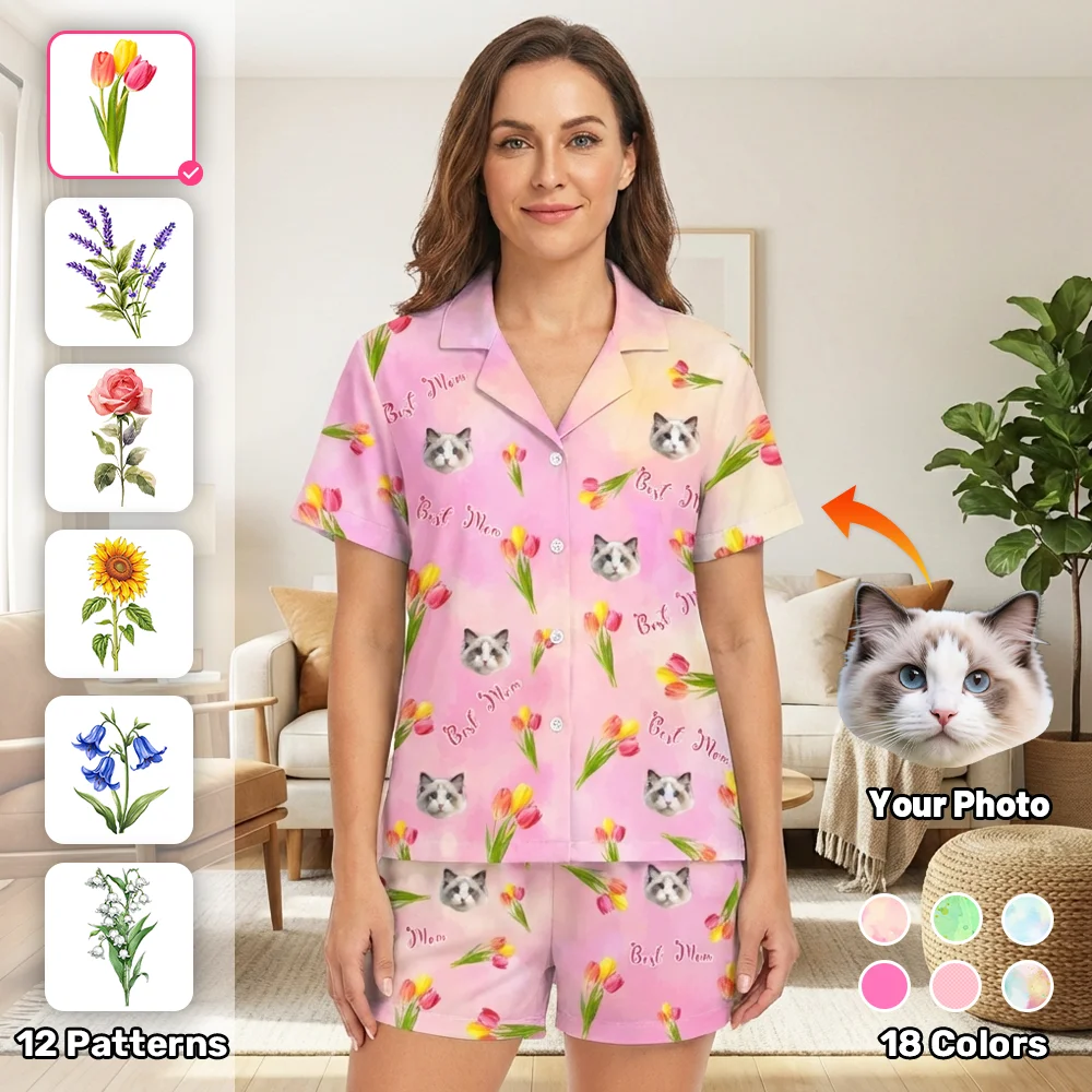Custom Short Sleeve Pyjama With Your Face Tulip Floral Pattern Mother's Day Gift for MumCustom Short Sleeve Pyjama With Your Face Tulip Floral Pattern Mother's Day Gift for Mum