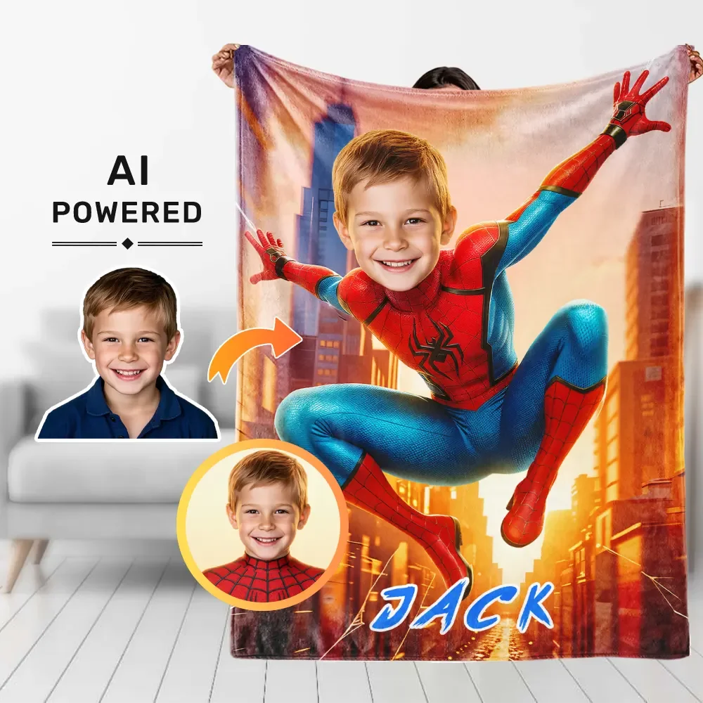 Custom Superhero Blanket AI Powered Superboy Jumps with Arms Outstretched in the City Gift for Boy